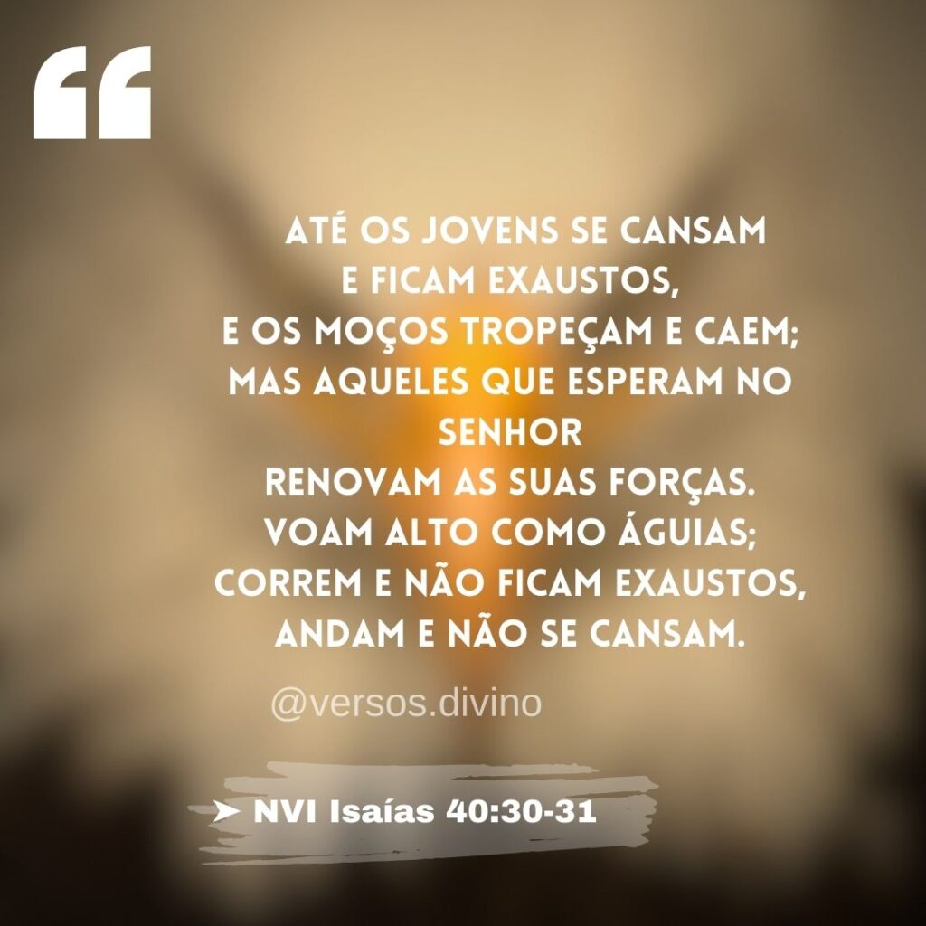 | Até os jovens se cansam e ficam exaustos, e os moços tropeçam e caem; mas aqueles que esperam no Senhor renovam as suas forças. Voam alto como águias; correm e não ficam exaustos, andam e não se cansam. ➤ NVI Isaías 40:30-31 |