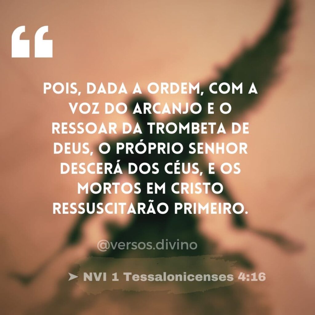 | Pois, dada a ordem, com a voz do arcanjo e o ressoar da trombeta de Deus, o próprio Senhor descerá dos céus, e os mortos em Cristo ressuscitarão primeiro. ➤ NVI 1 Tessalonicenses 4:16 |