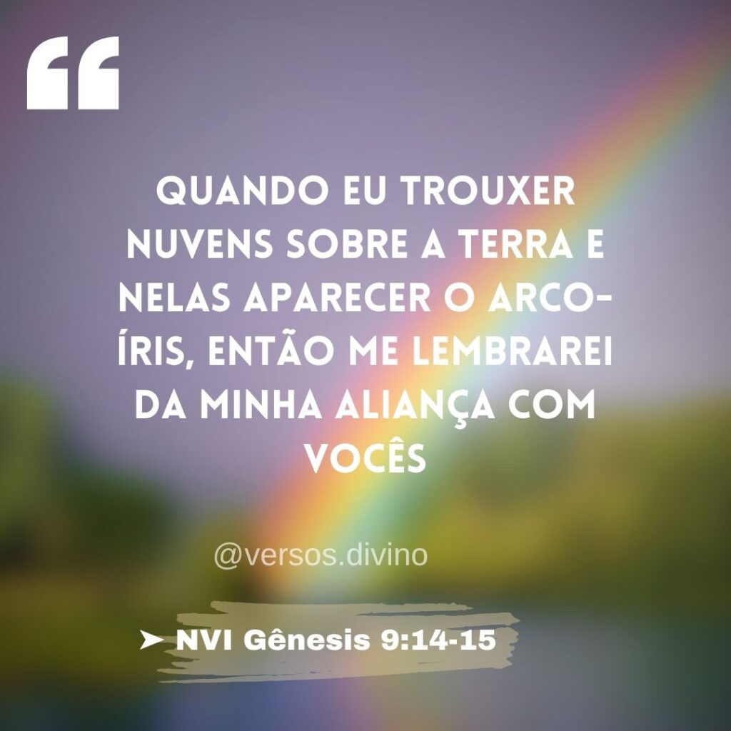 | Toda vez que o arco-íris estiver nas nuvens, olharei para ele e me lembrarei da aliança eterna entre Deus e todos os seres vivos de todas as espécies que vivem na terra”. ➤ NVI Gênesis 9:16 |
