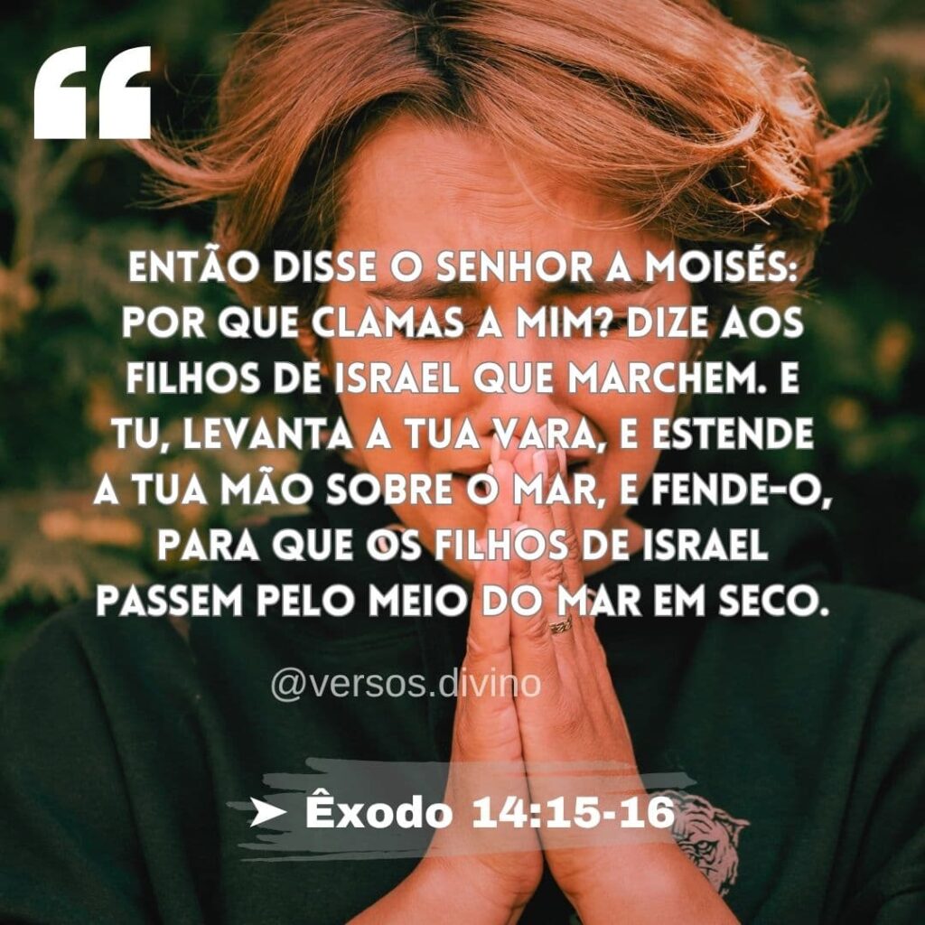 | Então disse o Senhor a Moisés: Por que clamas a mim? Dize aos filhos de Israel que marchem. E tu, levanta a tua vara, e estende a tua mão sobre o mar, e fende-o, para que os filhos de Israel passem pelo meio do mar em seco. ➤ Êxodo 14:15-16 |