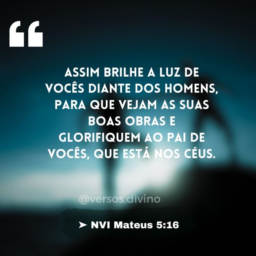 Vocês são a luz do mundo. Não se pode esconder uma cidade construída sobre um monte. Assim brilhe a luz de vocês diante dos homens, para que vejam as suas boas obras e glorifiquem ao Pai de vocês, que está nos céus.