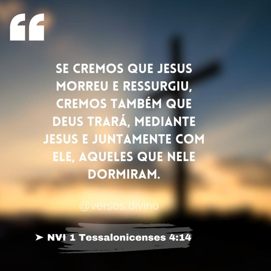 | Se cremos que Jesus morreu e ressurgiu, cremos também que Deus trará, mediante Jesus e juntamente com ele, aqueles que nele dormiram. ➤ NVI 1 Tessalonicenses 4:14 |
