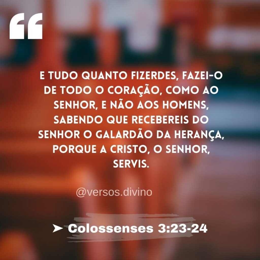 | E tudo quanto fizerdes, fazei-o de todo o coração, como ao Senhor, e não aos homens, sabendo que recebereis do Senhor o galardão da herança, porque a Cristo, o Senhor, servis. ➤ Colossenses 3:23-24 |